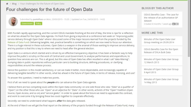 Four challenges for the future of Open Data A new blog post, “Four challenges for the future of Open Data”, by ODUG member Giuseppe Sollazzo has been published on data.gov.uk: http://data.gov.uk/blog/four-challenges-future-open-data… Read More